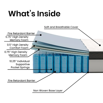 A great night’s sleep is essential to maintain both your physical and mental well-being so choosing the best full mattress is paramount. This hybrid full mattress, offering pocket spring support with the added benefit of luxurious memory foam layering, will give you the firmness you need with the softness you crave. The foam is CertiPUR-US Certified so it’s free from heavy metals, phthalates, BPDE, formaldehyde and has reduced VOCs so you can rest easy knowing your indoor air quality won’t be compromised. Extra cushioning on this full bed mattress cradles your body in every position, keeping your back, neck and shoulders more comfortable throughout the night while also being ultra-supportive to provide the restful sleep you and your family deserve. Say goodbye to morning joint stiffness and wakeful nights. Our medium-firm full mattress features individually wrapped pocket spring coils that reduce motion transfer to help you stay asleep while minimizing pressure points and back pain. This full-size memory foam mattress is compatible with trundle beds, platform beds and adjustable bed frames, when using with a standard bed frame a box spring or other foundation is required. Arriving fully compressed and boxed, this full bed in a box can be easily moved where you need it. The top-quality construction of this memory foam padded mattress ensures long-lasting use and its integrated handles make transportation effortless. Perfect for your first house or apartment, or converting your child to a “big kid” bed, this full size bed mattress achieves the ideal blend of comfort, support and durability that will definitely upgrade your sleeping experience.