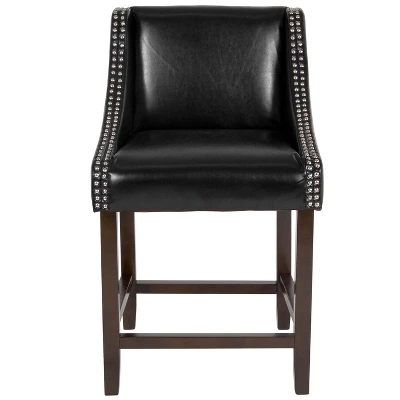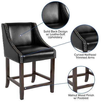 Bring warmth and comfort to your home while adding some world class elegance with this set of 2 classically sophisticated white counter stools. Have breakfast at your kitchen island or hang out with friends around the dining room table in style. Boasting soft and durable LeatherSoft upholstery paired with decorative nail head trim, this counter height stool lends a touch of old world style and comfort to any environment. When hosting guests the last thing you want to worry about is a wobbly chair. The solid wood frame and legs provide a sturdy base for this dining stool that will hold up to 300 lbs weight capacity. An integrated footrest gives your feet a comfortable place to rest and relieves pressure from your legs. The gently curving arms add a touch of whimsy to this upholstered stool and the deep seat, featuring CAL 117 fire retardant foam, is an invitation to lounge, relax and enjoy the atmosphere. Enjoy the comforts of this full back stool anywhere around the home. Spills or soil can be quickly cleaned with water and a neutral detergent. To ensure smooth movement and protection of hard flooring surfaces, glides have been added