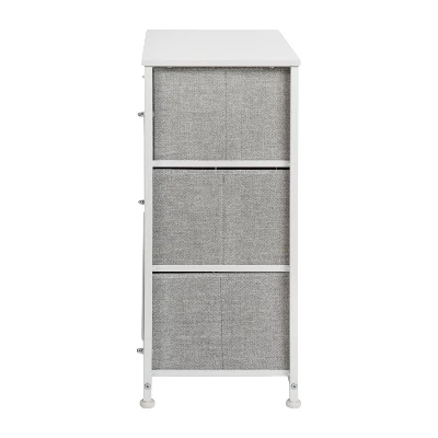 Get much needed storage at an economical price that works anywhere in your living space with this 3 drawer vertical organizer. Whether you need a place for current or out of season clothing, washcloths, or charging cords and remote controls, the three easy pull fabric drawers are a perfect solution. Use this vertical storage tower as a nightstand to hold your cell phone, glasses, or nighttime glass of water. Storage doesn’t have to be bulky to be strong. Metal screw construction securely joins the powder coated cast iron frame of this fabric dresser together. The durable engineered wood top provides a hard surface to set books, lamps, or a vase of fresh flowers and holds up to 40 lbs. static weight capacity. Non-Woven fiber drawers not only look great but are fade and stain resistant to help this dresser with drawers retain its great looks. Quick and easy assembly can be achieved in 10 minutes or less with the step-by-step illustrated instructions or online PDF. Plastic adjustable floor glides protect your hard flooring surfaces and provide a stable platform on uneven flooring surfaces. Quickly remove spills with a clean damp cloth. Use this vertical dresser in or out of your closet for extra organization that goes above and beyond plain plastic bins