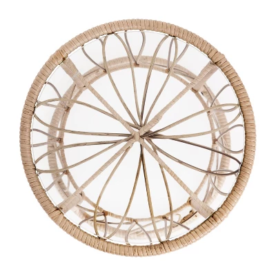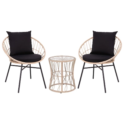 Relax at the end of a long day with this 3 piece faux rattan patio set. Weather and fade resistant woven rattan rope adds Bohemian flair and deep, papasan style chairs with plush, comfort foam padded cushions provide added comfort. The powder coated steel frame supports up to 300 lbs. static weight. A matching woven rattan table with a 5mm thick clear tempered glass top gives you a place to set drinks, snacks and anything else you may need. Stylish and durable, this conversation set is ideal for use on decks, patios, porches and can even be used indoors as unique accent furniture. Fixed glides on the chairs and adjustable glides on the table protect your indoor flooring surfaces from damage. Each chair assembles in under 10 minutes and the table arrives ready for use. Clean with a damp cloth or remove the cushion covers to hand wash and air dry.