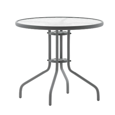 Create the perfect relaxing or entertainment environment with this patio table. This glass table will enhance your bistro, cafe, restaurant, hotel or home patio space. The ripple designed table top features a smooth surface for keeping items level. The table was designed for all-weather use making it a great option for indoor and outdoor settings. For longevity, care should be taken to protect from long periods of wet weather. A black powder coat finish lends the round-shaped table a bold, versatile appearance that matches well with your favorite chairs.