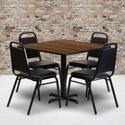 Don’t have time to search through hundreds or thousands of table and seating options? This complete Banquet Table and Chair set saves you time to focus on your growing business. This set includes an elegant Walnut Laminate Table Top, X-Base and 4 Black Banquet Chairs that have a 500 lb. capacity rating to accommodate all users. Surface is heat, scratch and moisture resistant. Easily clean using a mild detergent and water, dry clean to keep your tables spotless. Use this setup in banquet halls, wedding ceremonies, hotel conferences, restaurants, break room/cafeteria settings or any other social gathering. Whether you are just starting your business or upgrading your home or business furniture this restaurant quality table set will round out your dining space. Additional Features: Available in Multiple Colors, High Impact Melamine Core, Protective T-Mold Edge Band, 22″ x 22″ X-Base with 3″ Diameter Table Height Column, Cast Iron Construction, Easy 2-Piece Assembly with Single Bolt, Top Plate Pre-Welded to Column, Powder Coated Frame Finish, Table Size: 36″W x 36″D x 30″H, Trapezoid Back Banquet Chair, 500 lb. Seating Capacity, Stacks 15 Chairs High, Seamless Back Panel, Vinyl Upholstery, Upholstered Seat and Back