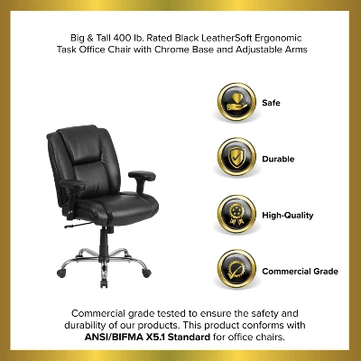 Having the proper desk chair in your workspace can provide you with significant health benefits but finding an office chair for those who aren’t comfortable in a standard chair can be difficult. Big & Tall office chairs are designed to accommodate larger and taller body types offering a broader seat and back width. This chair has been tested to hold a capacity of up to 400 lbs. A mid-back office chair offers support to the mid-to-upper back region. This office chair features plenty of thick, plush padding to provide greater support. The waterfall front seat edge removes pressure from the lower legs and improves circulation. Chair easily swivels 360 degrees to get the maximum use of your workspace without strain. The pneumatic adjustment lever will allow you to easily adjust the seat to your desired height. The adjustable armrests take the pressure off the shoulders and the neck, which minimizes the risk of pain. The chrome base adds a stylish look to compliment a contemporary office space. Additional Features: 3″ Thick Foam Padded Seat with CAL 117 Fire Retardant Foam, 23″ Wide Swivel Seat, Pneumatic Seat Height Adjustment, Waterfall Seat reduces pressure on your legs, Chrome Base, Dual Wheel Casters, LeatherSoft is leather and polyurethane for added Softness and Durability