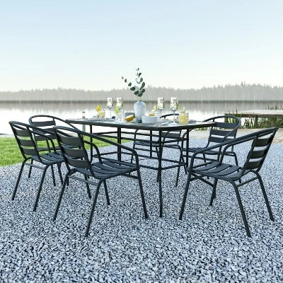 When you’re ready to host your next outdoor party or family BBQ, this seven piece patio dining set will provide the perfect place for your friends and family to come together. The 31.5″ x 55″ table features a metal frame and a tempered glass top with a smooth surface and designer rippled look. Complete with an umbrella hole, you can enjoy your outdoor space rain or shine by pairing with one of our 9′ patio umbrellas and a base. Six lightweight aluminum chairs with curved slat backs give your guests a comfortable place to sit and stack up to 22 high when not in use for easy storage. The chairs arrive ready to use while the table assembles in 30 minutes or less. The all weather materials are perfect for outdoor use, but for longevity, care should be taken to protect the set from extended periods of exposure to wet weather