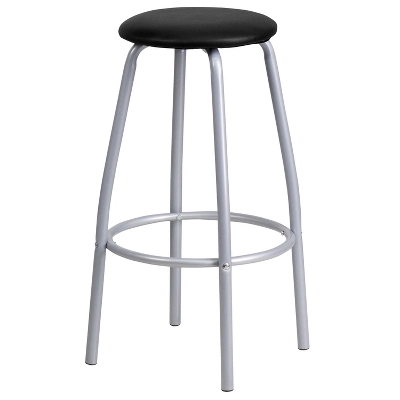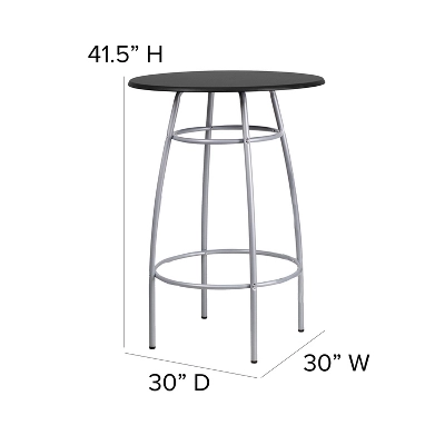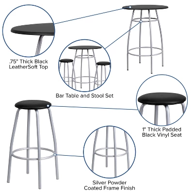 Complete your dining room or kitchen with flair when you bring home this black and silver table and chair set. Table features a black LeatherSoft top that matches the chair’s seat, and complements the silver powder coated frame finish. Boasting a thick top, the table from this set can carry heavy loads while its silver powder coated frame provides exceptional stability. The bowed legs attach to a rounded footrest which highlights this table while the chairs feature a rounded seat with black vinyl upholstery, and backless design. This space-saving set is perfect for eat-in kitchens, bar area or game area. Additional Features: Stool Size: 13″W x 28.5″H; 225 lb. Weight Capacity, 1″ Thick Padded Black Vinyl Seat, Silver Powder Coated Frame Finish