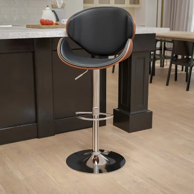 If you’re looking for unique seating for your breakfast bar or kitchen island this retro beechwood finish bentwood adjustable height barstool is a great fit . Reminiscient of earlier decades, the curved back and seat are covered in black vinyl upholstery and padded with 2″ CAL 117 fire retardant foam to cradle you in comfort. The attached footrest promotes good posture and relives pressure from your legs while the 360 degree swivel allows you to easily hold conversations in any direction. A sturdy metal pedestal base holds up to 330 lbs. to accommodate most users. Easily adjust from counter to bar height with the handle located below the seat. The base and footrest have a chrome finish to complement the chair’s vintage design. To help protect your floors, the base features an embedded plastic ring. Keep this stool looking great with a solvent and water based cleaner such as foam. Additional Features: Seat Adjusts from Counter to Bar Height, Footrest Provides Better Sitting Experience, 17.625″ Round Base with non-skid embedded plastic ring, Swivel barstool for kitchen island and home bar