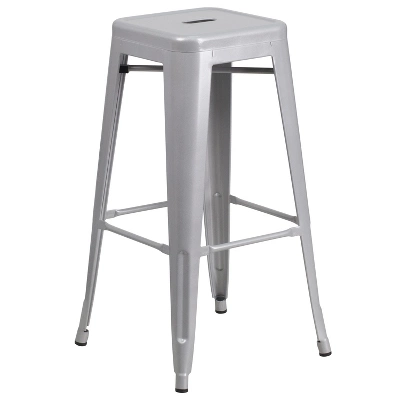 Complete your dining room, restaurant or patio with this chic bar table and chair set. This colorful set will add a retro-modern look to your home or eatery. Table features a smooth top and protective rubber floor glides. The stackable barstools feature plastic caps that prevent the finish from scratching while being stacked. This 5 piece table set is designed for indoor and outdoor settings. For longevity, care should be taken to protect from long periods of wet weather. The possibilities are endless with the multitude of environments in which you can use this table, for both commercial and residential spaces. Additional Features: Backless Design, Square Seat with Drain Hole, Cross Brace under seat provides extra stability, Plastic Caps on cross brace protect finish when stacked, Footrest