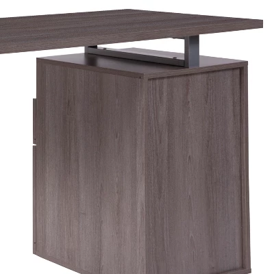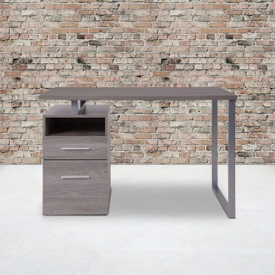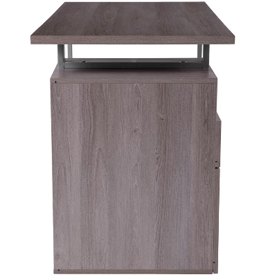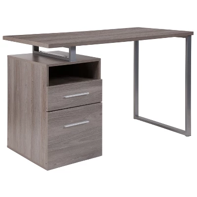 Blending the engineered look of exposed metal and the organic feel of the wood grain finish, this dark ash wood grain finish computer desk with two drawers and silver metal frame is the perfect complement to your home or office space. This pedestal desk features a ‘floating desktop’ accentuated by a silver powder coated frame while two box drawers offer a convenient place to store important documents that you need to keep within reach while working. Pair with a LeatherSoft office chair with wood backing or an all LeatherSoft executive chair for a sophisticated and inviting home office space. Top with an arm desk lamp, photos and a writing utensil holder. Additional Features: Shelf Size: 12.25″W X 19″D X 4.5″H, Top Drawer Size: 12.25″W X 13″D X 4″H, Bottom Drawer Size: 12.25″W X 13″D X 10″H, Powder Coated Frame Finish