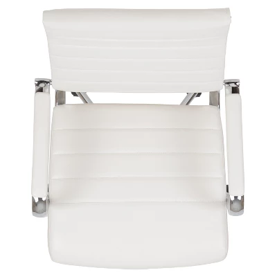 Sleek and modern describe this executive swivel office chair that will satisfy any office. You’ll fall into comfort with the ribbed back desk chair backed by curved lumbar support. An integrated back bar provides a convenient position to hang garments such as coats and jackets. See the distinction light improvements will accomplish for your office with a neutral coat of paint, bright LED lighting, decorative art pieces and this ribbed office chair. Take the pressure off your shoulders and neck by resting your arms on the integrated padded arms that are framed by a glossy chrome finish. Adjust the chair to your desired height by utilizing the lever underneath the seat that also locks the chair in an upright position. When you want to lean back pull the lever out and use the knob to adjust the force that’ll be required to recline. Lessen pressure from your lower legs with the waterfall seat edge which improves circulation. Redesign your hotel business center, meeting room or home office with this high back desk chair to carry your space into the new century. Coordinate your entire office with our armless and mid-back versions. Additional Features: Tilt Lock Mechanism rocks/tilts the chair and locks in an upright position, Tilt Tension Adjustment Knob adjusts the chair’s backward tilt resistance, Pneumatic Seat Height Adjustment, 5-Star Chrome Base with Dual-Wheel Casters, LeatherSoft is leather and polyurethane for added Softness and Durability