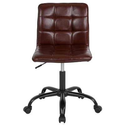 This functional chair has beauty and style and would be a complement to your home or office. This brown LeatherSoft upholstered task chair is adjustable and comfortable, with sumptuous tufted padding in the seat and back. LeatherSoft is leather and polyurethane for added softness and durability. Chair rotates 360 degrees to provide easy access to your work surfaces. A pneumatic seat height adjustment lever lets you easily position the chair at a height that is most comfortable for you. The dark frame and dual wheel casters create a contrasting detail that is sure to be noticed. This fashionable task chair will make a great addition, whether it is the focal point or an attractive accent. Additional Features: 360 Degree Swivel Seat to reach multiple work surfaces, 5-Star Metal Base with Dual-Wheel Casters for effortless mobility, Dual Wheel Casters