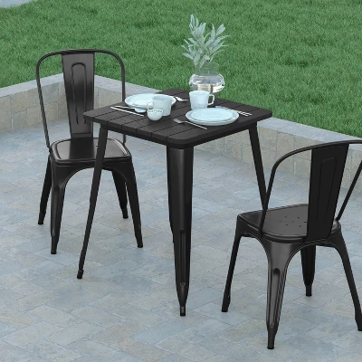 Instantly up your commercial or residential dining or lounge spaces with the upmarket look of this 23.75″ square indoor outdoor dining table. The slatted poly resin top paired with a steel frame lends a contemporary yet rustic look to any decor from industrial to farmhouse. Create a cozy spot to have drinks or dinner for 2 in your restaurant or pub or take the fun outdoors to your patio dining areas. Designed to stand up to the rigors of the hospitality industry, as well as busy households, this commercial table boasts a polystyrene top that will not rot, chip or peel and a 20 gauge steel frame that will hold up to 200 lbs. static weight capacity. Stainless steel hardware is rust resistant making this patio table ideal for year round use both indoors and out. Assembly takes less than 10 minutes with the included tools and cleanup is a snap with a damp cloth for quick seating turnaround. Adjustable floor glides ensure a stable, level surface and protect your indoor flooring from damage. Pair this table with other sizes or shapes in our collection for a cohesive look throughout your home or business.