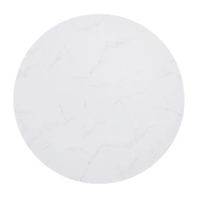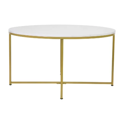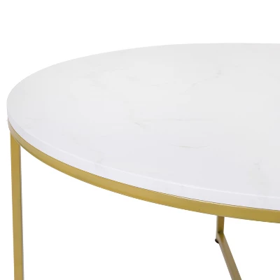 Update the atmosphere in your home with the sophisticated, polished look of this mixed media coffee table. Featuring a marbled white finished laminate top, this occasional table blends seamlessly in any space. The round shape atop modern crisscross brushed gold metal legs completes the overall look of this stunning piece. Whether you’re serving coffee, tea, or just want a place for decorative items, you will never have to worry about the safety of this table. The strong .5 inch thick engineered wood top stands up to daily use while the sturdy cross brace metal frame holds up to 55 lbs. static weight capacity. A durable powder coated finish ensures this living room table will look great for years to come. Have your new coffee table ready to use in under 30 minutes with the included step-by-step instructions and included tools. Floor glides will protect your hard flooring surfaces from scuffs and scrape and messes clean up quickly and easily with a water based cleaner.