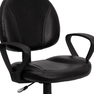 At first glance this task chair looks like your basic looking office chair, but look closer. This chair lends comfort with LeatherSoft upholstery, ergonomic contoured cushioning and a depth adjustable back. The back depth adjustable knob allow you to slide the back outward which can accommodate users with longer legs. LeatherSoft is leather and polyurethane for added softness and durability. Curved nylon arms can help reduce neck and shoulder fatigue. The pneumatic adjustment lever will allow you to easily adjust the seat to your desired height. This mid-back swivel ergonomic task office chair with arms is a comfortable desk chair with a small profile that won’t take up a lot of space in your home or office