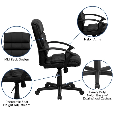 The versatility of a task chair can easily transition from a receptionist’s desk to the training room. Practical and adaptable for most office settings, mid-back office chairs are the logical choice for performing an array of tasks. Upholstered in beautiful LeatherSoft upholstery, this task chair will lend a sophisticated look to your workspace. LeatherSoft is leather and polyurethane for softness and durability. The tilt lock mechanism rocks/tilts the chair and locks in an upright position while the tilt tension adjustment knob adjusts the chair’s backward tilt resistance. A mid-back office chair offers support to the mid-to-upper back region. This chair is ideal for anyone who does a great deal of typing throughout the day and needs good back support. The waterfall front seat edge removes pressure from the lower legs and improves circulation. Chair easily swivels 360 degrees to get the maximum use of your workspace without strain. The pneumatic adjustment lever will allow you to easily adjust the seat to your desired height.