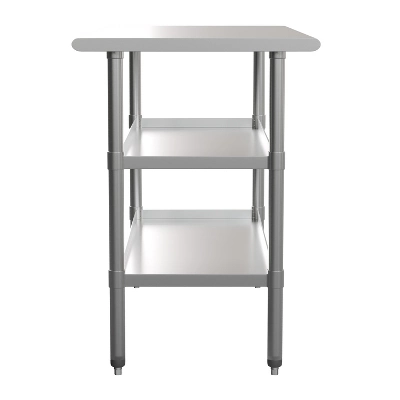 Give yourself some extra space for home-based catering and increase functionality in your kitchen with this stainless steel work table with 2 adjustable undershelves. This stainless steel prep table is a great space for bulk food preparation or for storing unused appliances or utensils. This steel table can be placed against a wall or used as a freestanding kitchen island. This metal utility table resists corrosion and holds up to 600 lbs. while each of the undershelves hold up to 200 lbs. The stainless steel is certified to NSF quality standards. Rounded corners prevent scrapes and cuts and this work table assembles in under 10 minutes with the included tools. Adjustable feet adjust up to 1″ to provide a level work surface. Remove any traces of food contaminants with water and a neutral detergent followed by a dry cloth. Additional Features: Cleans Easily with Water and a Neutral Detergent Followed by a Dry Cloth, Assembles Quickly in 10 Minutes or Less, Stainless Steel Work Table for your industrial kitchen island, weekly food prep, laundry folding or extra pantry room.