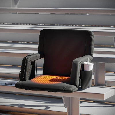 If you love going to watch your favorite football team or hanging out at the campsite but don’t love the colder outdoor temperatures, this heated portable reclining stadium chair is the perfect solution. This backpack chair boasts a heated seat powered by a USB cable that simply plugs into a USB power bank (not included). Featuring low, medium, and high temperature settings as well as 15, 30, and 60 minute timers settings, this foldable stadium chair will keep you cozy and comfortable. Featuring 6 recline positions, dual storage pockets, a thickly cushioned back and seat, and the ability to be used with or without armrests, this must have indoor/outdoor chair meets your every seating need. When you’re done for the day, simply lay the chair flat and use the adjustable backpack straps to free up your hands while you take the chair with you to the car, RV, or into the house. The slim profile makes vertical or horizontal storage a breeze. Premium, long-lasting materials ensure this multifunctional reclining chair is strong and reliable. The metal frame is strong, but lightweight for carrying and the heavy duty polyester fabric back and seat are coated for water and UV resistance. Built-in safety features include a reinforced non-slip underside that provides additional grip to prevent sliding while bottom straps snap into place to securely attach yourself to the bleachers and the safety sensor on the temperature control will turn the chair off to prevent overheating. A slim profile makes vertical or horizontal storage a breeze and best of all, no assembly is required for your new outdoor recliner. Wipe clean to maintain the looks of this backpack chair.