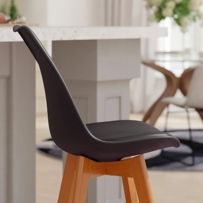 Add contemporary style to your dining room or kitchen with this set of two bar height dining stools. Comfortable and stylish, the rounded high back design features soft and durable plastic upholstery in white and a matching attached faux leather seat cushion for added comfort. A durable wooden frame and solid wood legs in an attractive oak finish add strength and stability with a 300 lbs. static weight capacity. Sturdy cross bracing serves double duty as an integrated footrest offering leg support for added comfort. The legs are fitted with felt pads to ensure smooth movement and protect hard flooring surfaces from damage. Each stool assembles in 30 minutes or less with the included, step-by-step instructions. For easy cleaning, simply wipe away dust and debris with a dry cloth.