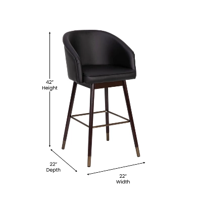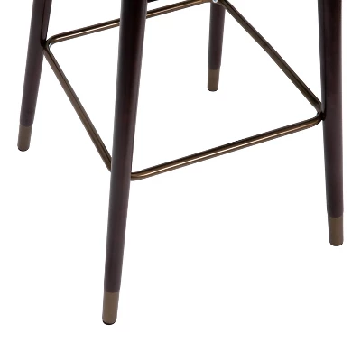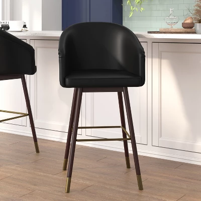 Modern styling and unique details let this set of two dining stools make a bold statement in your home. Featuring soft and durable faux leather upholstery in black with a generously padded seat and contoured backrest to provide supportive comfort. The sturdy beechwood frame is finished in a beautiful walnut color with soft bronze tipped solid wood legs in soft bronze, capable of supporting up to 300 lbs. of static weight while fixed glides protect your flooring from damage. The included instructions make assembly a snap in 30 minutes or less so you can let your home refresh inspiration flow. The low maintenance upkeep is perfect for busy lifestyles. Simply wipe down with a dry cloth when needed to keep your chair looking its best. Available in bar and counter height options and singles or sets of two to mix and match for a custom seating arrangement.